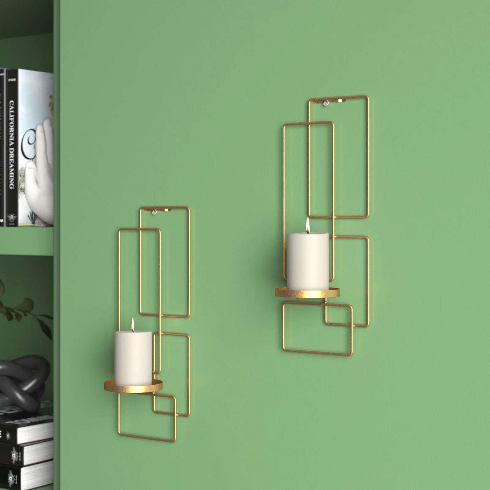 This geometric wall sconce candle holder set is a great decorative addition for entryways, living rooms, kitchens, and bedrooms. Wall sconces candle holder can hold one candle on each. This item ships in 1 carton. Easy and ready to hang feature with sawtooth hook at the back; nails and screws are not included. Suitable for indoor use only. These wall candle holders come as a set of 2.. Contemporary style.