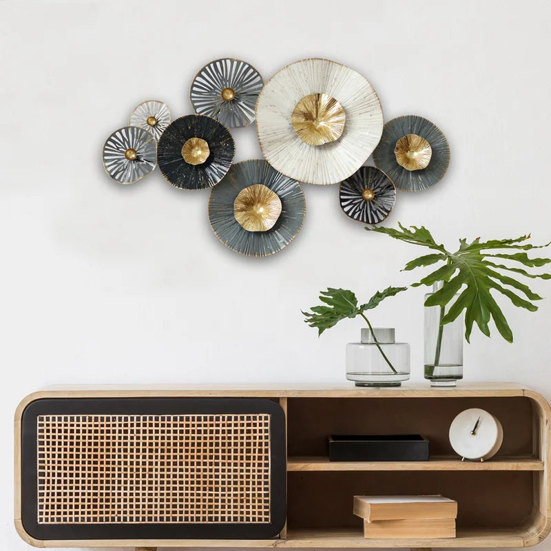 This abstract wall decor piece brings a bit of nature into your home, but with a bold twist. It's handmade from distressed metal in neutral tones of gray, gold, black, and white to blend in with a variety of styles and color schemes. Multiple circular pieces are held together with grooved lines and patterned edges to mirror a collection of lily pads for a modern boho look we love. It comes in one piece.