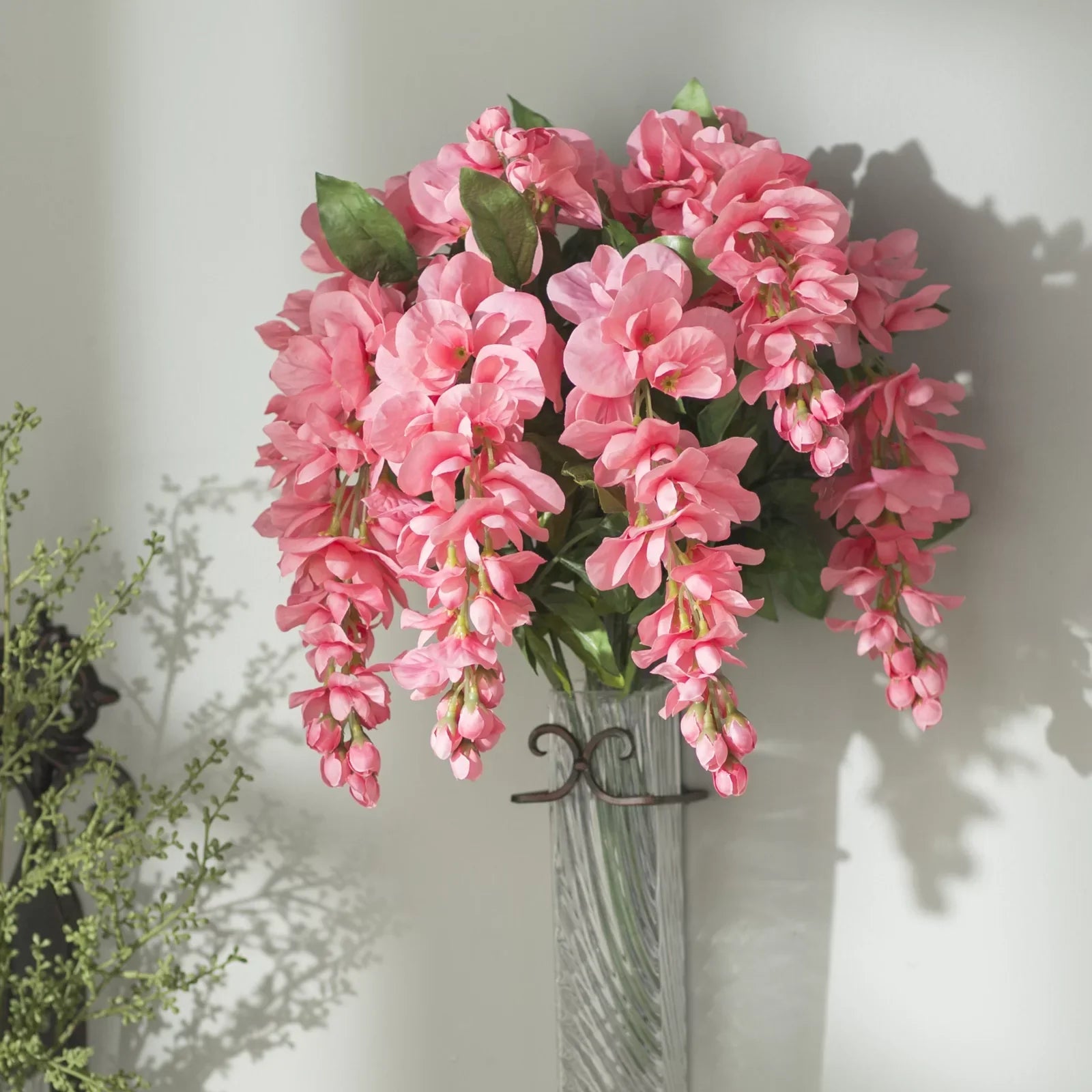While we love fancy florals, we don't always love the upkeep. Between finding that perfect slice of sunlight, remembering to water, and considering the benefits of plant food, our blossoms never stay beautiful for long. Rather than struggle with those greens straight from the garden, just let this lovely wisteria stem dress up your display instead! Showcasing a bushel of wisteria blooms atop verdant stems and leaves, it features a realistic-looking polyester design. Tuck this eye-catching arrangement into a flea-market-found ceramic pitcher to craft an eye-catching centerpiece for your breakfast nook, chic as it shines under the light of a charming chandelier hanging overhead. Or, if your powder room is more in need of a pick-me-up, simply pair this bold bouquet with a tall glass vase (not included) to bring a splash of spring-worthy style to your morning prep space.